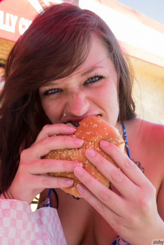 Description: Here you can see sweet and curvy brunette Zishy model Hannah Kinney photographed while eating. I hope some day we can see her naked tits and her pussy!