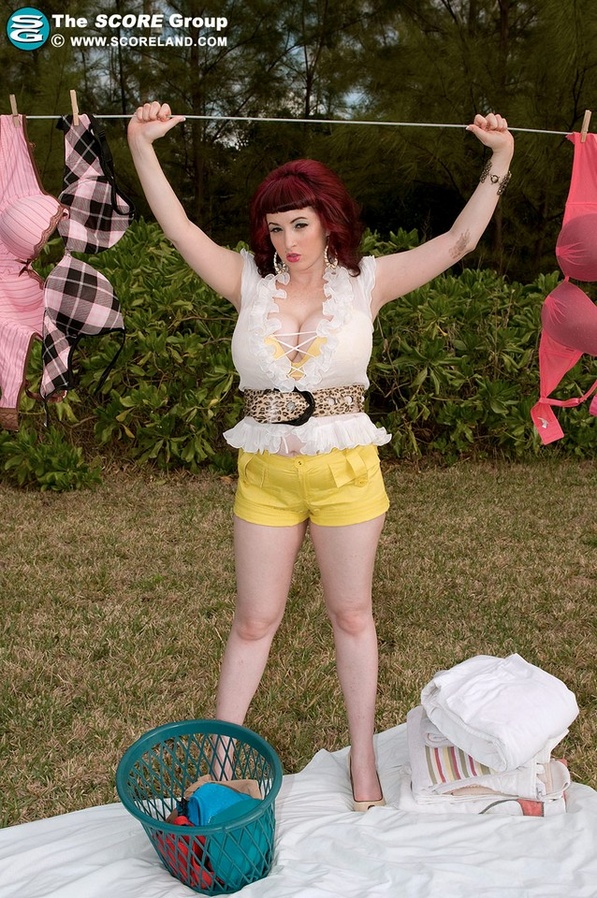 Description: Here I have a gallery for you showing a stunning redhead and Scoreland model with all natural big boobs posing outdoors...